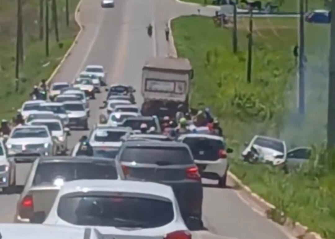 Para fugir do congestionamento, muitos motoristas utilizaram uma via de terra alternativa que dá acesso ao Bairro Delta Park. O condutor do Creta saiu ileso e relatou que a batida aconteceu durante uma tentativa de ultrapassagem do outro veículo.