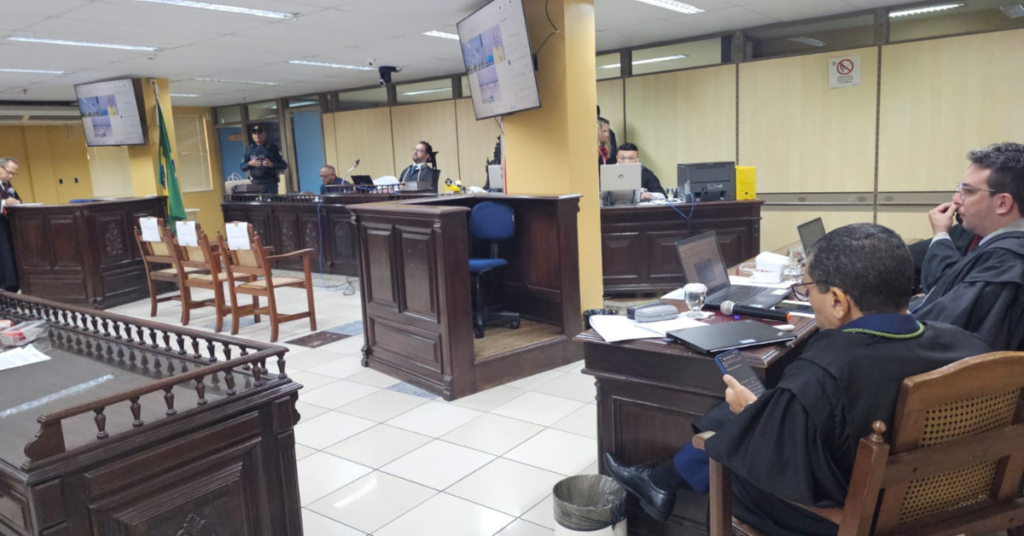 Sem testemunhas, a sessão teve início com o interrogatório dos acusados. O réu Lukas Abreu, único presente em plenário, foi conduzido pela penitenciária onde está preso e optou por permanecer em silêncio. Já os outros dois acusados, Francisco Kauã e Henrique Brito Moreira, participam do júri por videoconferência.