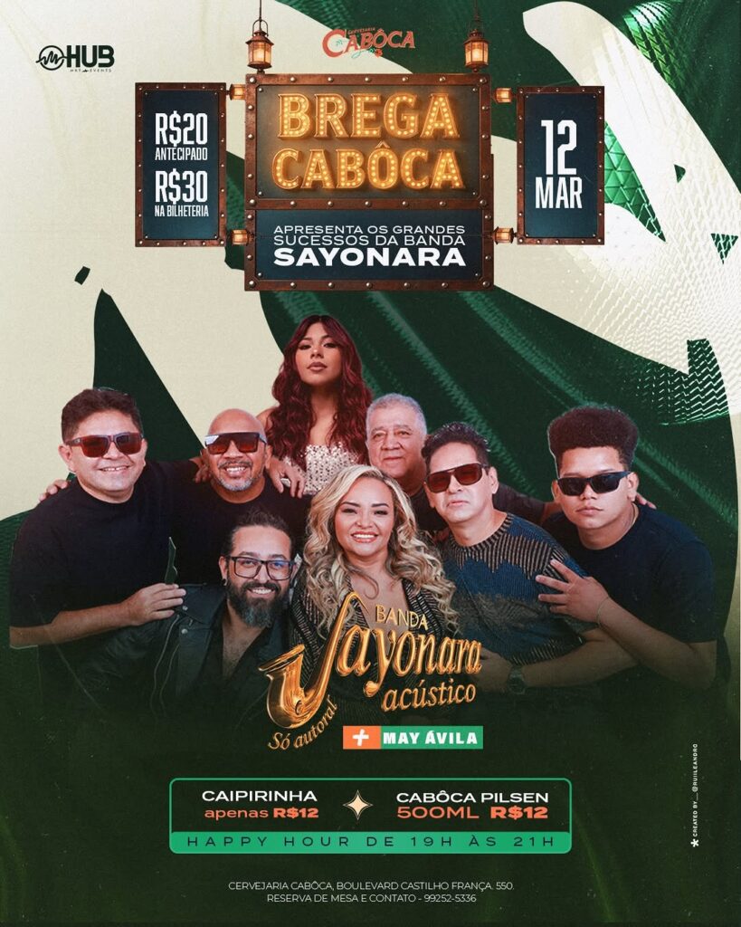 A programação musical também inclui a noite Brega Cabôca, dedicada ao repertório da banda Sayonara em versão acústica. O evento ocorre na Cervejaria Cabôca e conta com participação da cantora May Ávila.