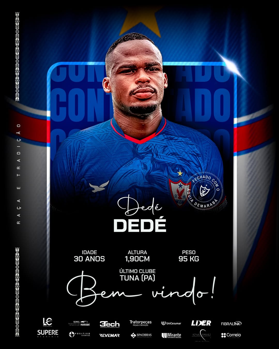 O zagueiro Dedé é o novo reforço do Águia para 2026. Aos 30 anos, o defensor vai defender pela primeira vez o clube marabaense após um extenso currículo no futebol paraense. O último clube dele foi a Tuna, onde disputou Parazão, Supercopa Grão-Pará, Copa Grão Pará, Copa do Brasil e Série D do Brasileiro.