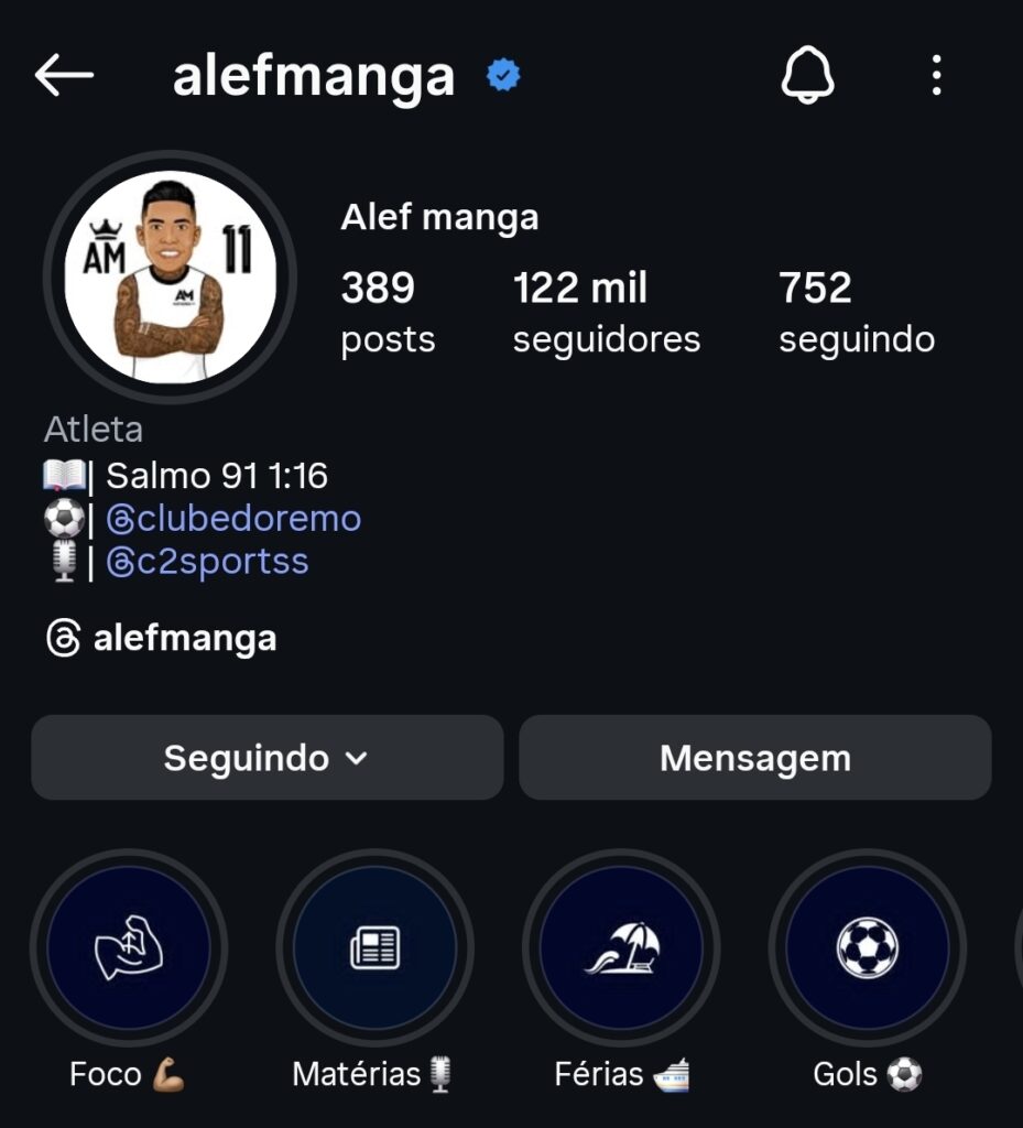 No Instagram, o atacante mudou a “bio” – parte que serve para descrição do perfil – e indicou já ser jogador do Remo. A mudança agitou os torcedores azulinos, que imediatamente compartilharam o print do perfil de Alef Manga.