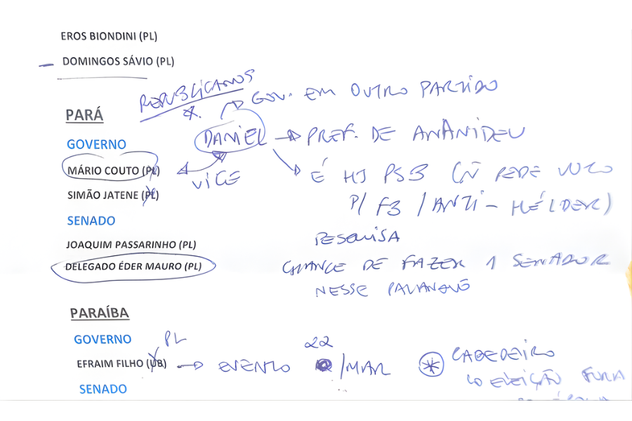 Na parte destinada ao Senado, constam os deputados federais Delegado Éder Mauro (PL) e Joaquim Passarinho (PL). Sobre Éder Mauro, há a anotação de que “há chance de fazer 1 senador nesse palanque”, sinalizando avaliação interna sobre o potencial eleitoral.