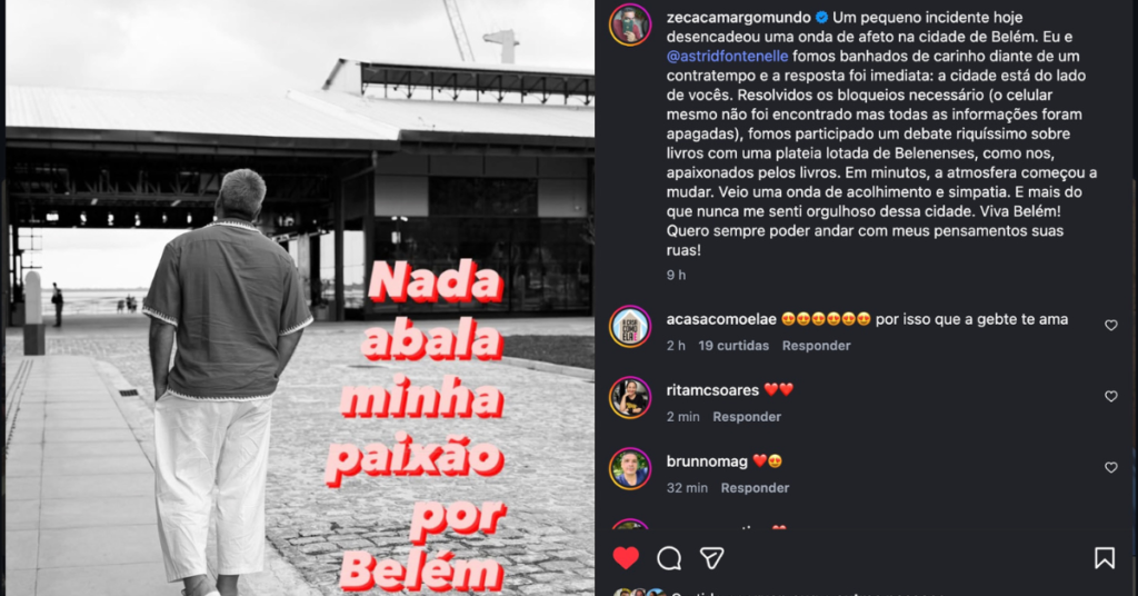 Ainda no domingo, Zeca publicou um relato emocionado destacando que o episódio acabou despertando uma forte onda de solidariedade por parte dos belenenses. “Um pequeno incidente hoje desencadeou uma onda de afeto na cidade de Belém. Eu e @astridfontenelle fomos banhados de carinho diante de um contratempo. […] Veio uma onda de acolhimento e simpatia. E mais do que nunca me senti orgulhoso dessa cidade. Viva Belém! Quero sempre poder andar com meus pensamentos nas suas ruas!”, disse no instagram.
