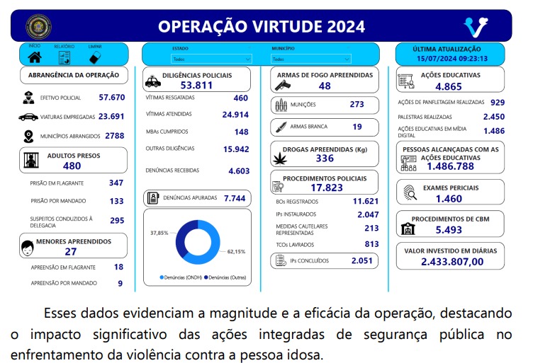 De acordo com o relatório geral da Operação Virtude 2024, a iniciativa foi considerada um sucesso nacional. As ações abrangeram todos os estados brasileiros, mobilizando mais de 57 mil agentes e resultando em 480 prisões de adultos e 27 apreensões de menores. Foram registradas 53 mil diligências, com 24.914 vítimas atendidas, 17.823 procedimentos policiais instaurados e 4.865 ações educativas realizadas em todo o país.