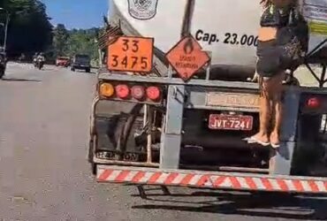 Na manhã desta quinta-feira (8) internautas flagraram uma mulher pendurada na escada em um caminhão-tanque ...