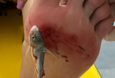 Uma foto que circula pelas redes sociais mostra um banhista que pisou em um peixe ...