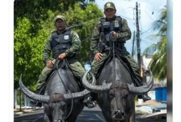 Uma foto que mostra dois policiais fardados fazendo ronda montados em búfalos viralizou nas redes ...