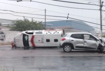 O carro particular ficou completamente destruído, a viatura capotou e alguns postes ficaram jogados na ...