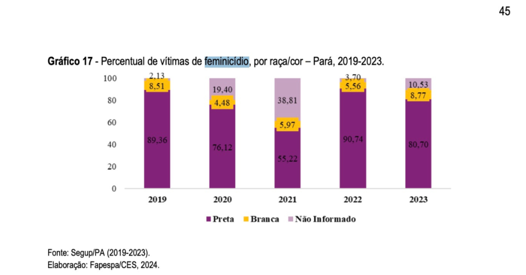Levantamento da Secretaria de Segurança Pública do Pará (Segup) revela que as mulheres pretas concentram a maioria das vítimas de feminicídio no estado, com percentuais que variaram entre 55% e mais de 90% ao longo dos últimos anos. Os dados reforçam o recorte racial da violência de gênero e evidenciam a maior vulnerabilidade das mulheres negras.