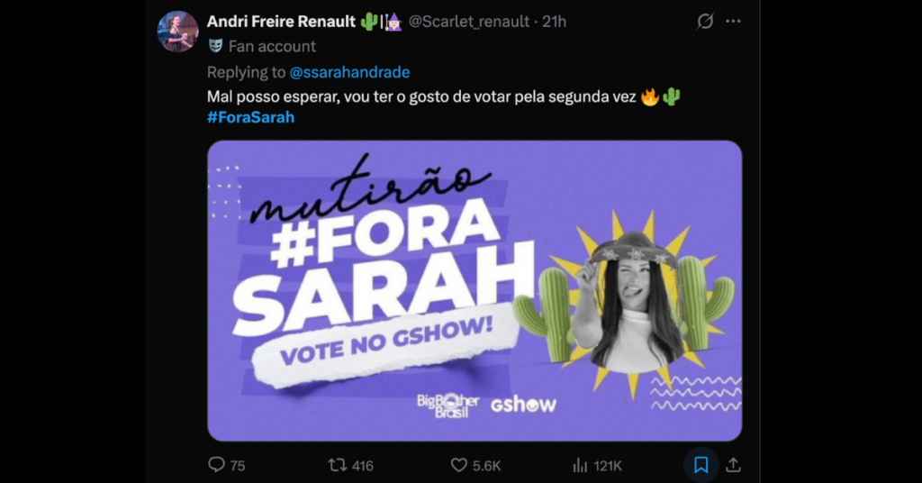 Entre os comentários publicados, internautas escreveram frases como “Mal posso esperar, vou ter o gosto de votar pela segunda vez fora Sarah” e “Bora, cactos e Renaults, chegou a hora da Sarah pagar por tudo que falou nesta edição”. Outras postagens reforçam o engajamento coletivo: “Agora é com a gente no #ForaSarah” e “Vamo pra cima, cactos e Renaults”.