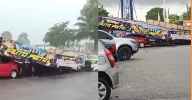Segundo relatos de testemunhas, o veículo se aproximava ou realizava uma manobra nas proximidades do parque quando acabou colidindo com a atração conhecida como “auto pista”. Com o impacto, a cobertura e parte da estrutura metálica do brinquedo cederam em poucos segundos, assustando pessoas que estavam na praça.
