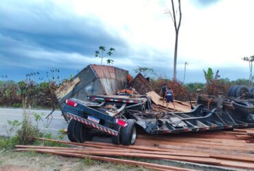 Caminhão carregado com madeira tomba e interdita parcialmente a rodovia Perna Leste, em Bujaru