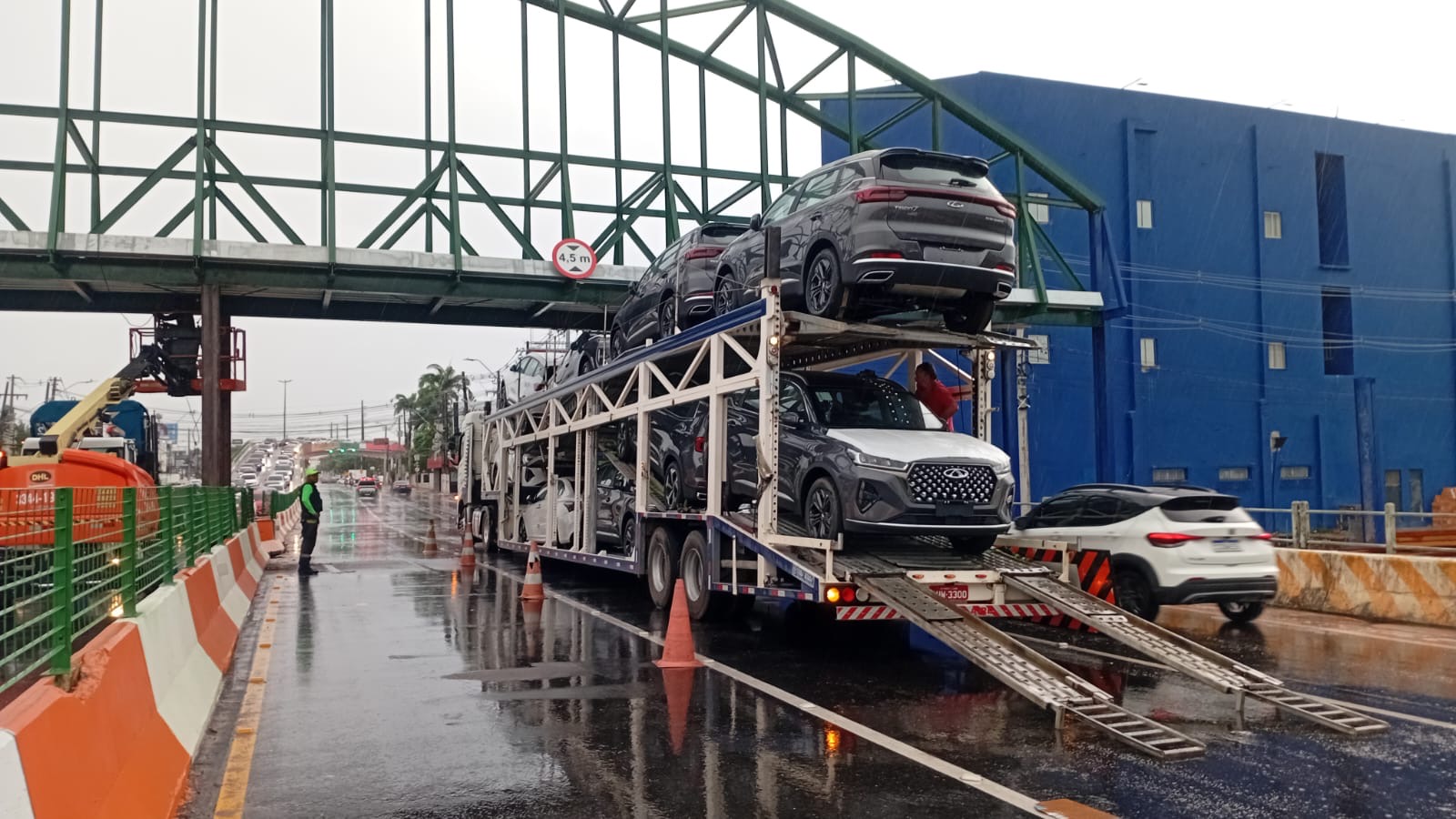Motoristas enfrentaram transtornos e congestionamentos na Avenida Júlio César, em Belém, neste sábado (25), após caminhões cegonha precisarem descarregar veículos no meio da pista para conseguir passar pela nova passarela instalada na via.
