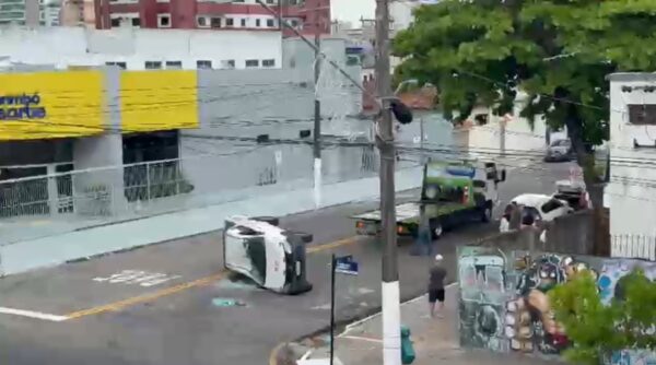 Com o impacto, a caminhonete perdeu o controle e acabou virando, ficando atravessada na via. Um guincho precisou ser acionado para remover o veículo do local.
