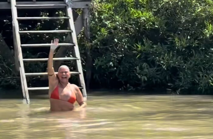 No vídeo, os canoeiros aparecem acenando e saudando a artista, que responde sorrindo enquanto aproveita o banho no rio.