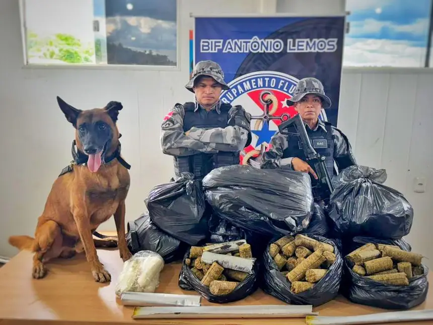 A descoberta dos entorpecentes contou com o suporte decisivo do cão farejador Jay-Z, do Grupamento Fluvial de Segurança Pública (GFlu).