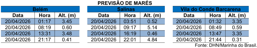 Na Região Metropolitana de Belém, o dia começa com céu bastante nublado e chuva pela manhã. À tarde e à noite, o tempo segue encoberto, com chuvas de intensidade fraca a moderada. Na capital, Belém, as temperaturas devem variar entre 24°C e 30°C, com umidade elevada, podendo chegar a 100%.