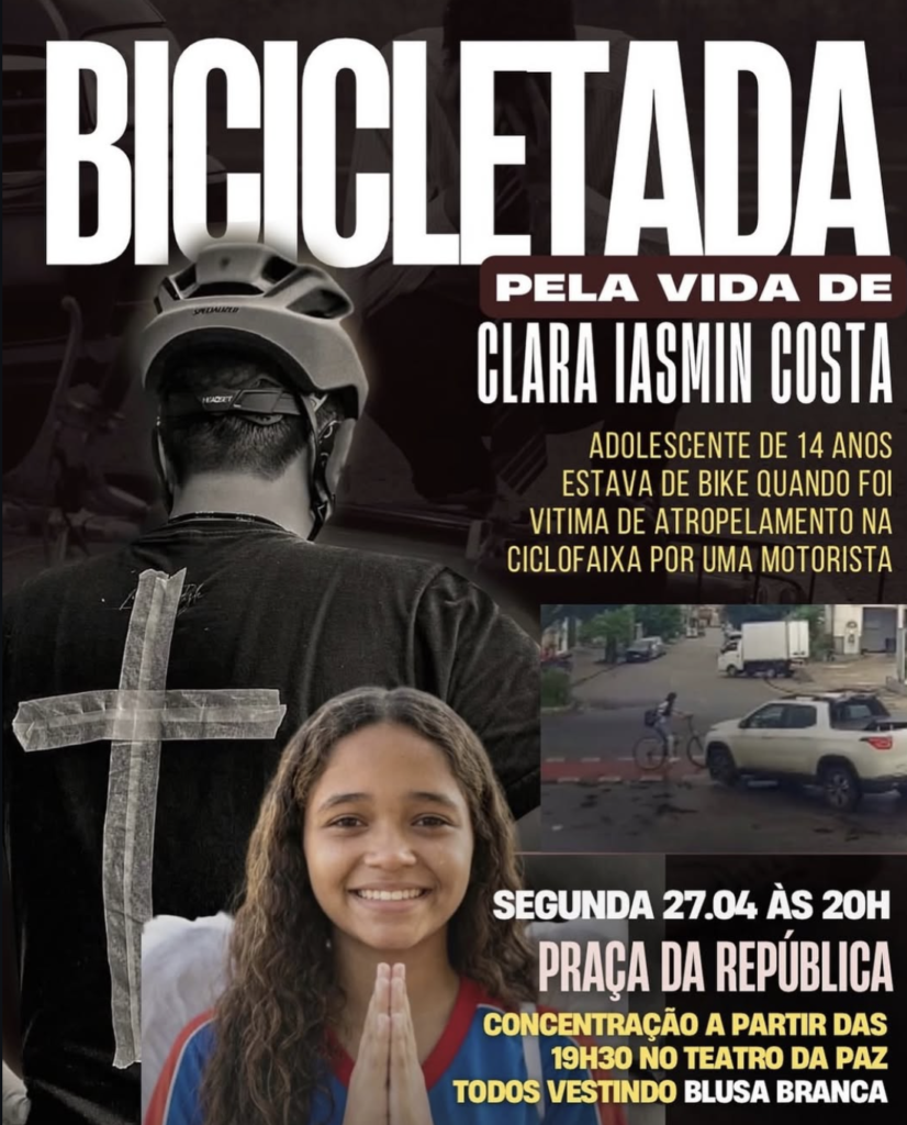 Coletivos de ciclistas e movimentos sociais de Belém realizam, nesta segunda-feira (27), um manifesto e homenagem póstuma à adolescente Clara Yasmin, de 14 anos, morta após ser atropelada por uma caminhonete na Avenida Senador Lemos.