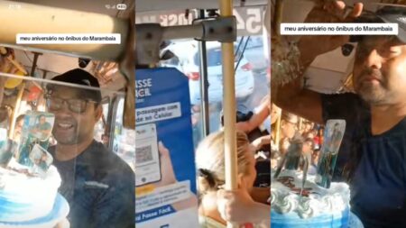 Um cobrador, que atua na linha Marambaia-Ver-o-Peso, viralizou após divulgar um vídeo em que aparece comemorando o próprio aniversário com usuários do transporte coletivo durante a viagem. A cena foi registrada no início da semana. No vídeo, é possível ver o cobrador segurando um bolo com recorte de fotos e balões espalhados pelo interior do veículo … Continue lendo Cobrador comemora aniversário com passageiros de ônibus em Belém: “Muito feliz”