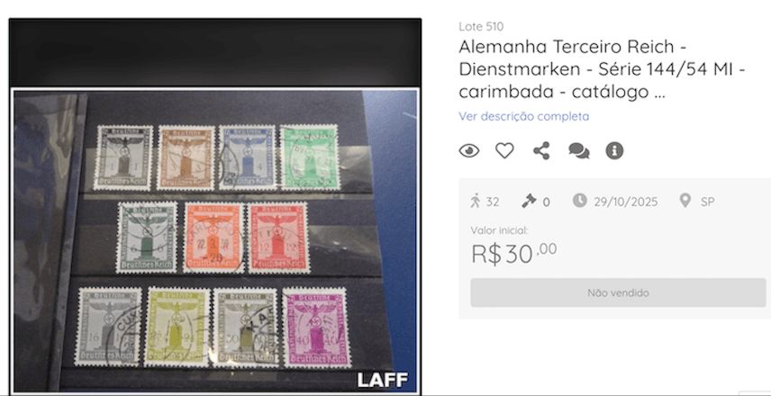 Durante buscas em sites de leilão e mecanismos de pesquisa, foi possível localizar, sem dificuldade, anúncios de broches, placas, selos, cartões-postais e outros objetos ligados ao regime nazista, alguns já arrematados por compradores. Parte dos vendedores tenta justificar as ofertas como itens de “valor histórico” ou “colecionáveis”, argumento que, segundo o CNDH, pode favorecer a naturalização desses símbolos e sua apropriação por grupos extremistas.