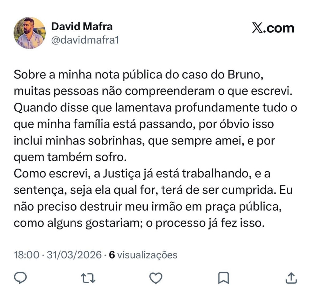 No novo texto, David afirmou que sua declaração anterior teria sido interpretada de forma equivocada e ressaltou que sua preocupação sempre envolveu também as sobrinhas, apontadas como vítimas no processo judicial. Segundo ele, o sofrimento mencionado anteriormente não se restringia apenas à família direta. “Quando disse que lamentava profundamente tudo o que minha família está passando, por óbvio isso inclui minhas sobrinhas, que sempre amei, e por quem também sofro”, escreveu.