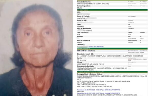 A decisão judicial que deveria garantir o atendimento imediato de Juventina Rosa Cardoso, vítima de Acidente Vascular Cerebral (AVC), virou motivo de angústia e denúncia da família. Mesmo com ordem expressa da Justiça do Pará, emitida na última terça-feira (9), a paciente continua internada na UPA do Distrito Dr. Nonato Sanova, em Ananindeua, sem o leito de UTI Adulto Tipo II determinado pelo juiz responsável pelo caso.