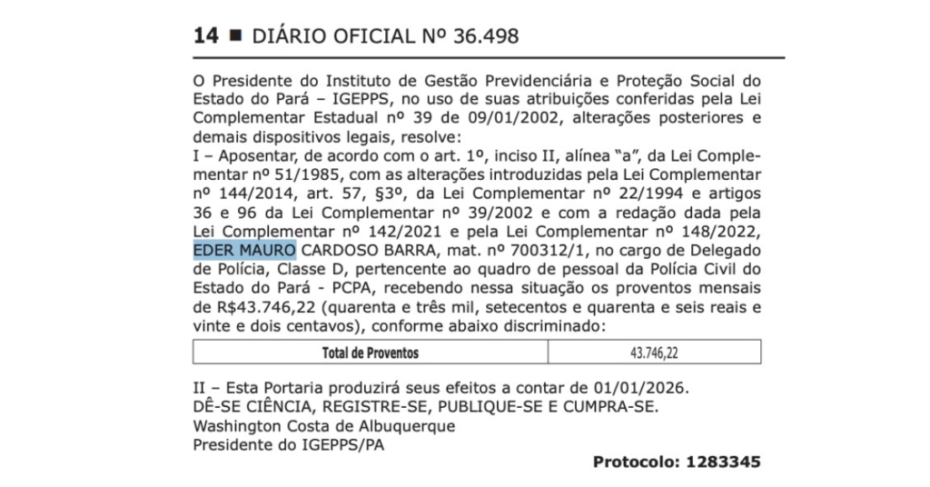 A aposentadoria foi concedida pelo Instituto de Gestão Previdenciária e Proteção Social do Estado do Pará (IGEPPS), com base em dispositivos legais que tratam do regime previdenciário específico das carreiras policiais. O ato é assinado pelo presidente do instituto e detalha que Éder Mauro ocupava o cargo de Delegado de Polícia – Classe D, no quadro permanente da PCPA.
