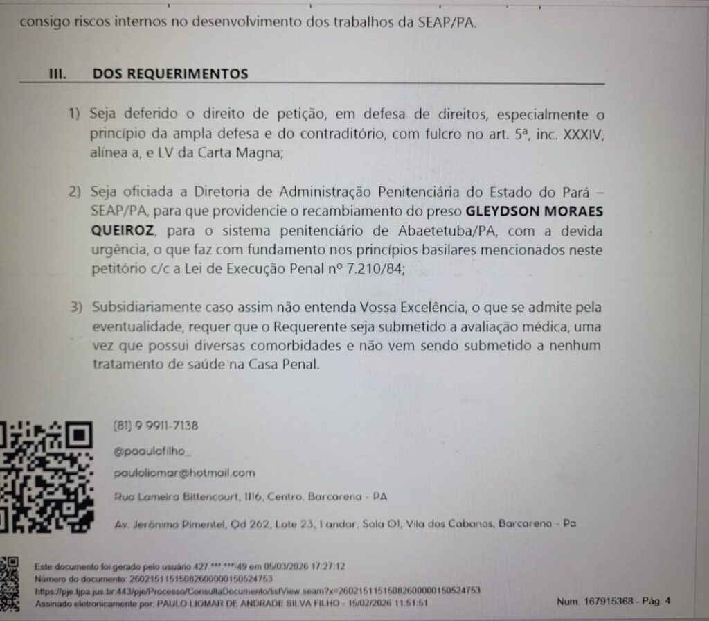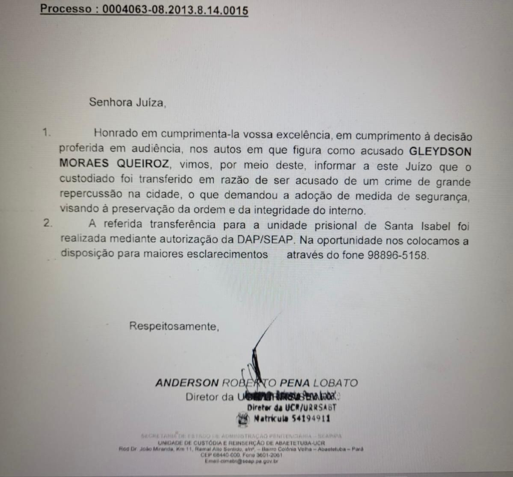 Um pedido de transferência do acusado para o presídio local gerou estranheza na juíza Pamela Carneiro Lameira, diante do apoio dado pelo Ministério Público. A magistrada demonstrou cautela ao ressaltar que o retorno do criminoso à cidade onde o crime ocorreu poderia provocar grave instabilidade e comoção popular.