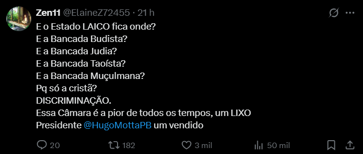Outros deputados de oposição também reagiram negativamente à criação de um bloco religioso dentro do Parlamento. A deputada Talíria Petrone (Psol-RJ) afirmou que o projeto “estabelece uma aliança de natureza religiosa dentro da estrutura do Legislativo”, o que fere o princípio constitucional da laicidade do Estado. Já o líder do PDT, Mário Heringer (MG), avaliou que a medida “discrimina outras religiões”.