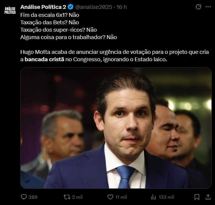 Em pronunciamento no mesmo dia, o presidente da Câmara, Hugo Motta (Republicanos-PB), afirmou que o requerimento de urgência foi levado à Mesa Diretora “a pedido das frentes parlamentares evangélica e católica”, e que a proposta busca unir esforços “em pautas de interesse da população cristã”. O anúncio foi feito durante um culto ecumênico realizado dentro da própria Casa, o que também gerou críticas.
