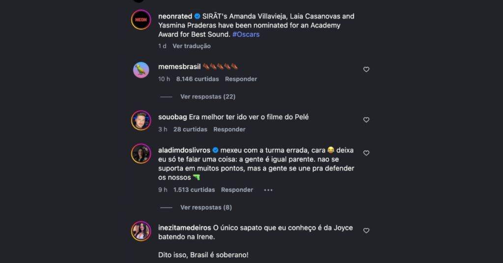 Após a repercussão da entrevista, publicações oficiais relacionadas ao filme Sirât e ao distribuidor internacional passaram a receber uma onda de comentários de brasileiros. Nos perfis, internautas reagiram com ironia, críticas e memes, muitos fazendo referência direta à comparação com “sapato”.