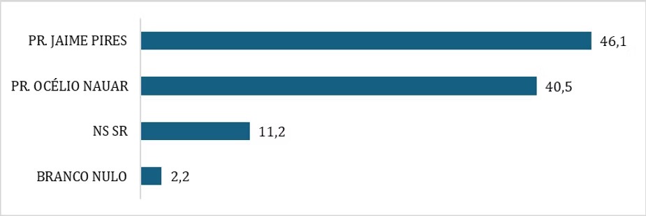 O levantamento do Doxa aponta que o Pastor Jaime Pires soma 46,1% das intenções de voto, enquanto o Pastor Océlio Nauar aparece com 40,5%. Outros 13,4% são votos flutuantes, isto é, estão indecisos ou pretendem anular o voto.