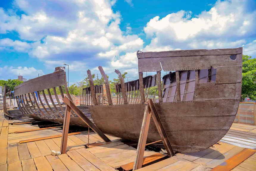 A embarcação metálica encontrada nas obras do Parque Linear da Nova Doca, em Belém, foi restaurada após um processo minucioso realizado entre fevereiro e julho deste ano. Atualmente, a peça passa por vistorias para identificar possíveis retoques na camada de revestimento antes de sua exposição ao público.