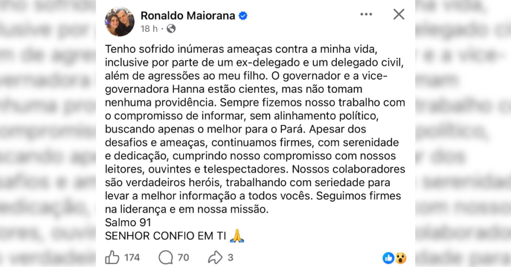 Publicação feita por Ronaldo Maiorana nas redes sociais, na qual o empresário relata ameaças contra sua vida e agressões ao filho