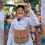 Pelo terceiro ano consecutivo, Erick acompanha a amiga Giovanna Nogueira no percurso entre a Catedral da Sé e a Basílica Santuário de Nossa Senhora de Nazaré. Para Giovanna, o Círio é mais que uma tradição religiosa; é um momento de gratidão e reflexão sobre as conquistas alcançadas.