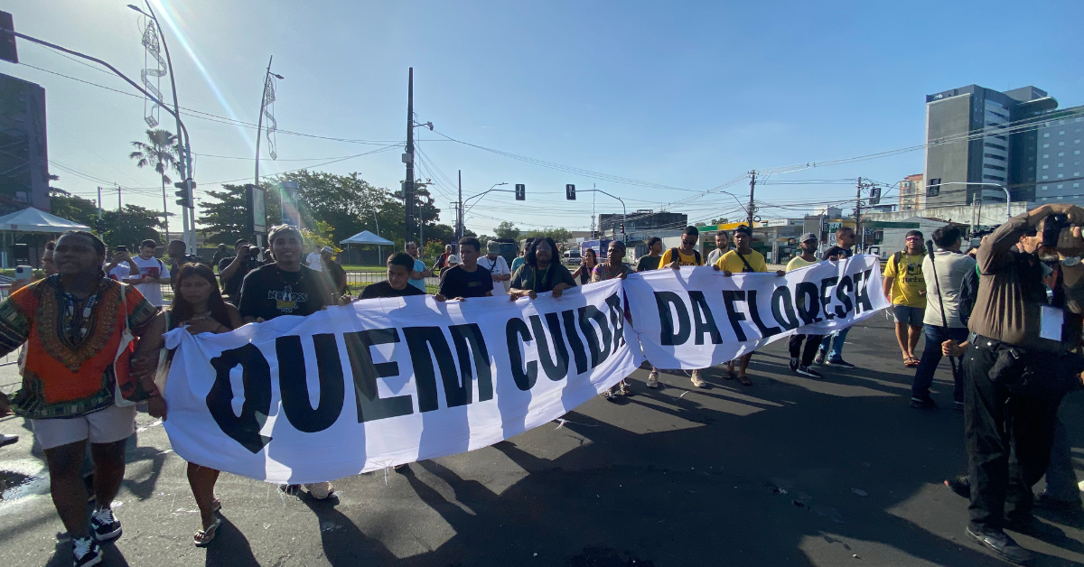 Os manifestantes fazem parte do coletivo Aliança dos Povos pelo Clima, uma nova força que retoma e atualiza o espírito da histórica Aliança dos Povos da Floresta — movimento que, nos anos 1980, uniu nomes como Chico Mendes, Raoni Metuktire e Ailton Krenak em defesa da Amazônia e da vida.