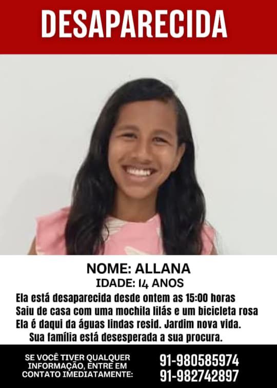 A família de Allana Rafaelly Silva, de 14 anos, está em busca de informações sobre o paradeiro da adolescente, desaparecida desde a tarde desta sexta-feira (5), no bairro Águas Lindas, em Ananindeua.