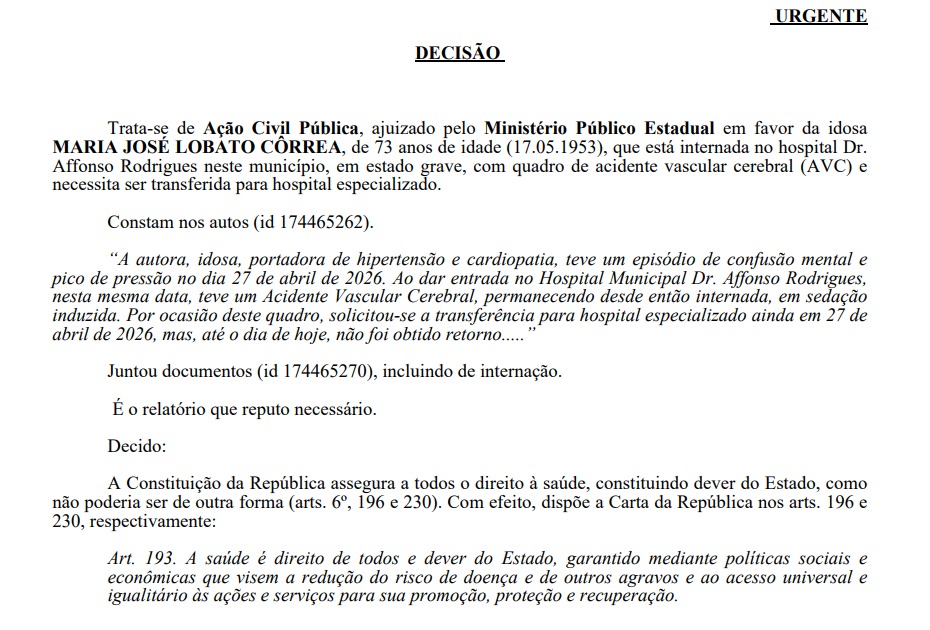 O documento destaca que o quadro clínico da paciente é grave e apresenta risco de danos irreversíveis à saúde, reforçando a necessidade de atendimento urgente. A decisão também estabelece que, caso não haja vaga na rede pública, o poder público deverá custear a internação em unidade particular no prazo máximo de 48 horas, sob pena de multa diária em caso de descumprimento.