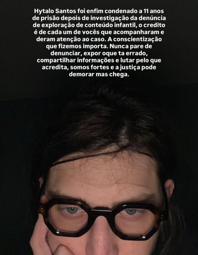 O influenciador digital Felipe Bressanim Pereira, conhecido como Felca, comentou nesta terça-feira (24) a condenação de Hytalo Santos e do marido, Israel Vicente, por produção de conteúdo sexual envolvendo adolescentes. A sentença foi proferida no sábado (21) pela Justiça da Paraíba e estabeleceu penas de 11 anos e 4 meses de prisão para Hytalo e 8 anos e 10 meses para Israel.