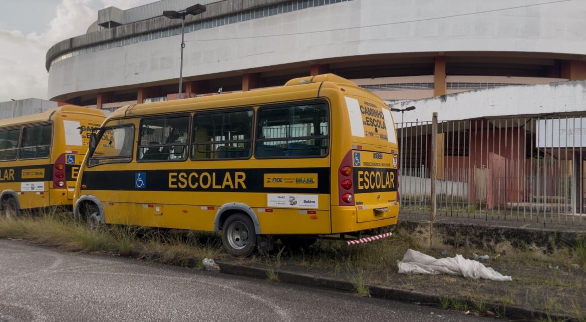 Oito ônibus escolares em boas condições foram flagrados estacionados ao lado do Estádio Olímpico do Mangueirão, em Belém. A cena chamou a atenção de quem passa pelo local e levantou questionamentos sobre o motivo de veículos aparentemente novos estarem parados há tanto tempo.