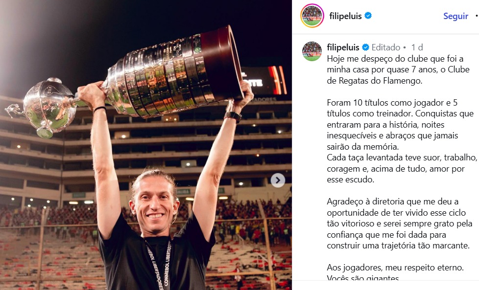 Minutos depois do fim da entrevista, o Flamengo divulgou nota oficial confirmando a saída do treinador, encerrando um ciclo de 16 meses no qual Filipe Luís conquistou cinco títulos.
