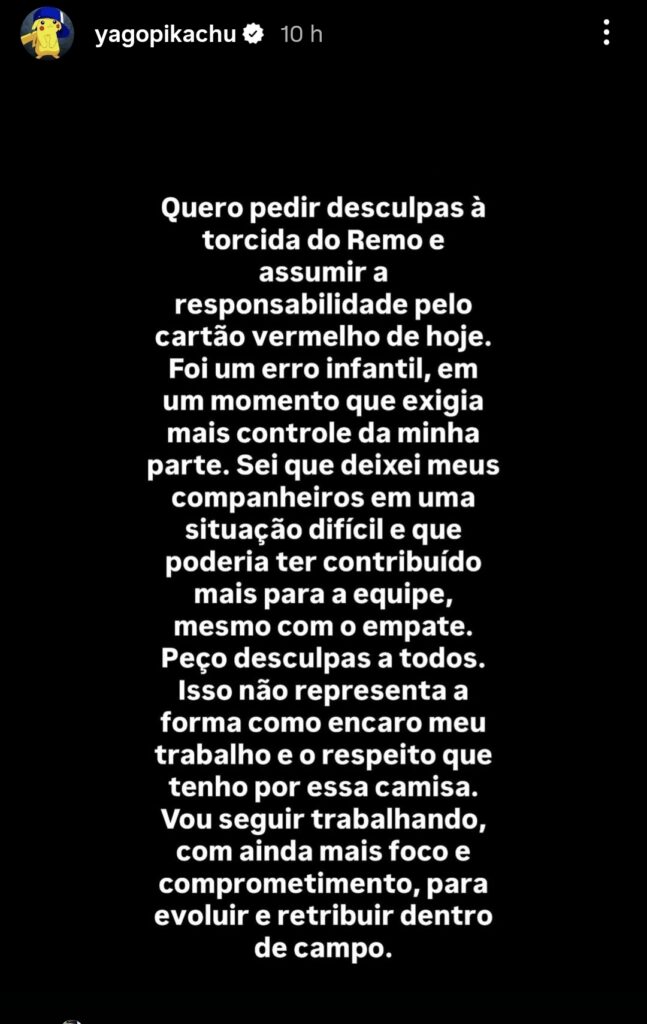 Quero pedir desculpas à torcida do Remo e assumir a responsabilidade pelo cartão vermelho. Foi um erro infantil em um momento que exigia mais controle da minha parte. Sei que deixei meus companheiros em uma situação difícil e que poderia ter contribuído mais para a equipe, mesmo com o empate”, escreveu.