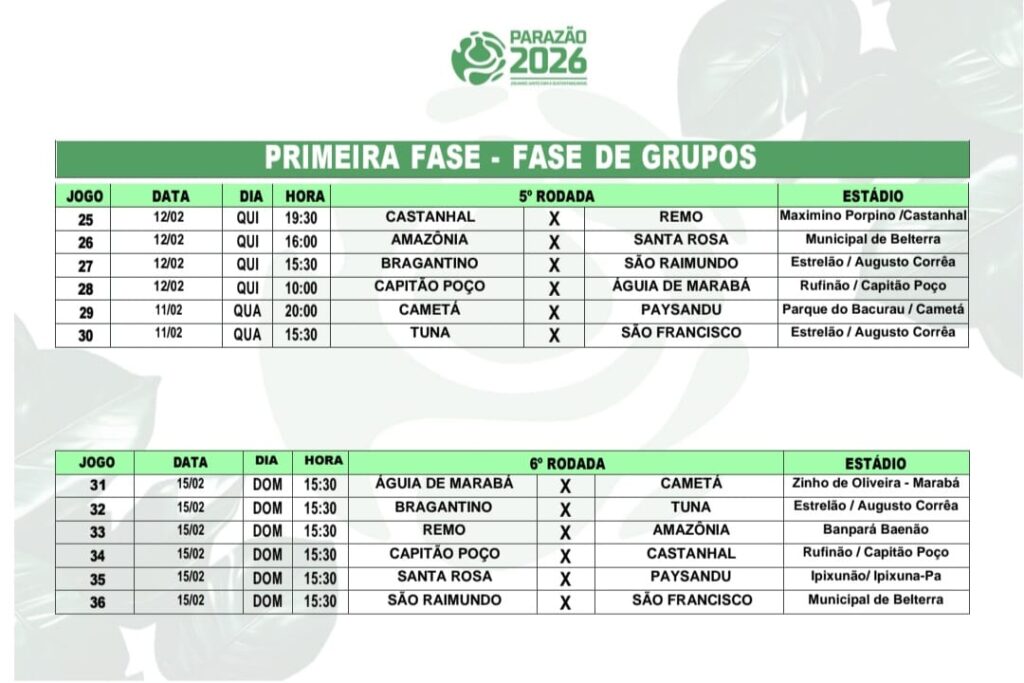A Federação Paraense de Futebol (FPF) divulgou neste sábado (7) a tabela detalhada das duas últimas rodadas da primeira fase do Campeonato Paraense.