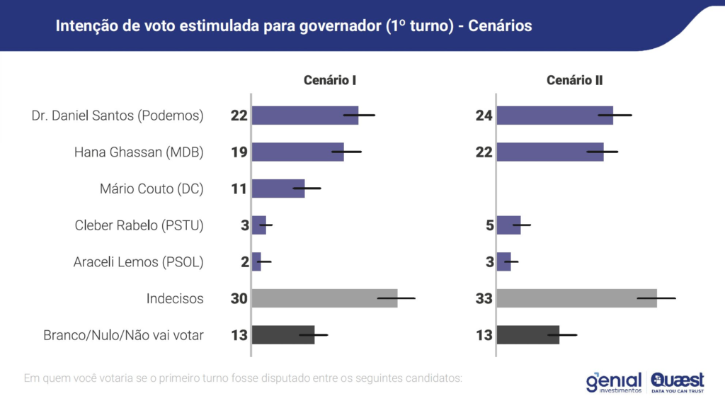 No cenário estimulado que inclui o ex-senador Mário Couto (DC), Dr. Daniel (Podemos) aparece com 22% das intenções de voto contra 19% de Hana Ghassan (MDB) . Como a margem de erro é de três pontos percentuais, ambos estão em situação de empate técnico. Mário Couto registra 11%, seguido por Cleber Rabelo (PSTU), com 3%, e Araceli Lemos (PSOL), com 2%.
