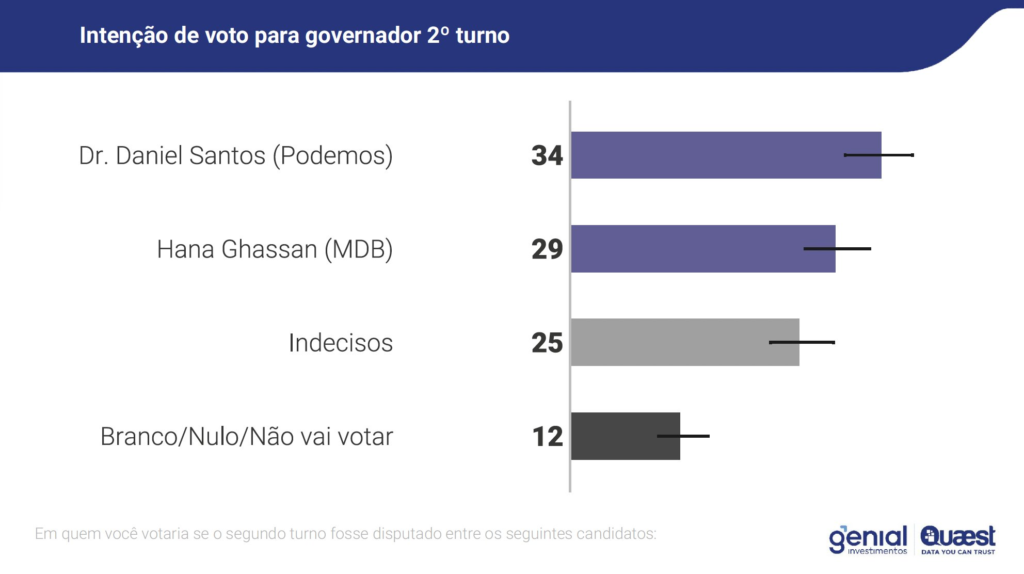 Caso a eleição fosse decidida hoje em um embate direto entre os dois principais nomes, o empate técnico persistiria. Dr. Daniel teria 34% (ou 35%, dependendo do arredondamento das projeções) e Hana Ghassan registraria 29%.