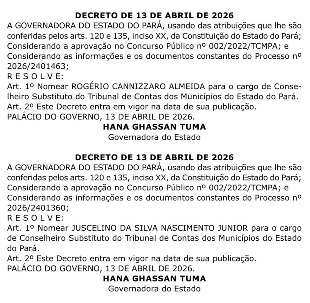 A governadora do Pará, Hana Ghassan (MDB), nomeou os novos conselheiros substitutos do Tribunal de Contas dos Municípios do Estado do Pará (TCM-PA), aprovados no concurso público realizado em 2022.
