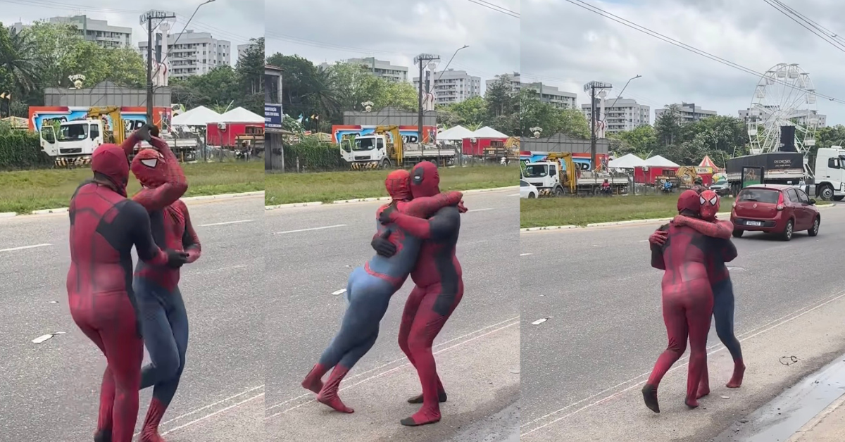Quem passava pela Avenida Independência, em Belém, foi surpreendido por uma cena digna de multiverso, mas com muito ritmo paraense. Dois animadores fantasiados de Homem-Aranha e Deadpool pararam o trânsito ao dançarem brega em plena calçada de uma loja de motos.