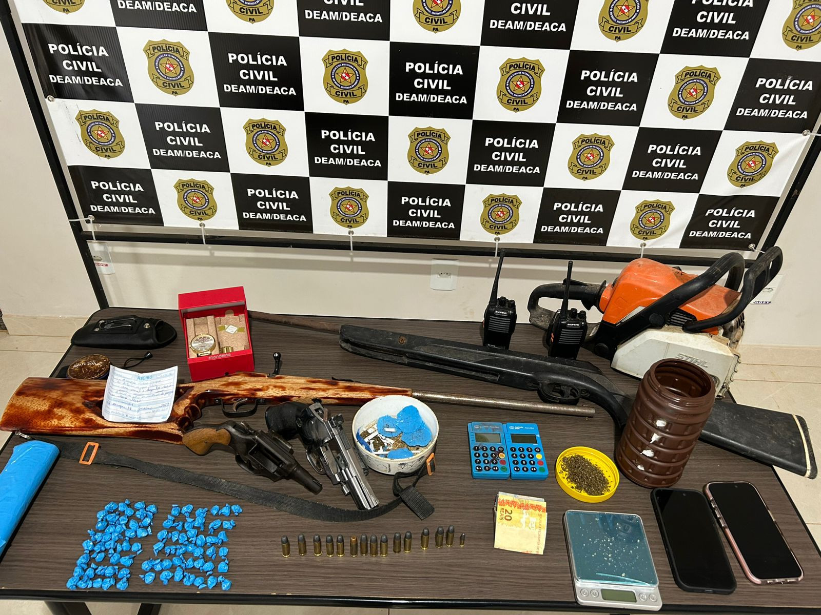 Na abordagem, o suspeito confessou que escondia armas e entorpecentes dentro do imóvel, no bairro Juventude. Os agentes apreenderam 79 papelotes de pasta base de cocaína, porções de maconha, duas espingardas, dois revólveres, munições, além de uma motosserra, um celular, um relógio e R$ 32 em espécie.