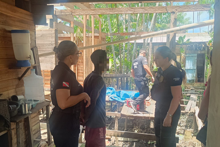 Após a denúncia, equipes da Polícia Civil se deslocaram até o local e encontraram o homem em estado de alteração. Durante a abordagem, foi necessário o uso de algemas devido à resistência e agressividade apresentadas.