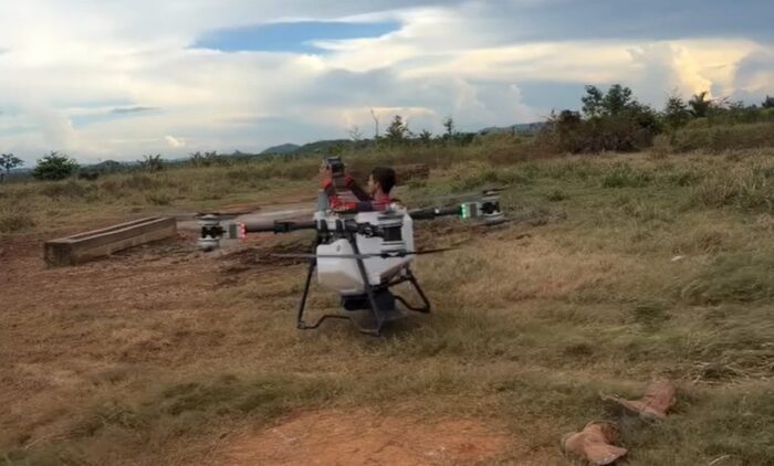O equipamento utilizado é um dos mais robustos do mercado voltado ao agronegócio. O DJI Agras T100 foi desenvolvido para operações profissionais em larga escala e possui alta potência, autonomia e sistemas inteligentes para pulverização no campo. O drone tem capacidade para transportar até 100 quilos de líquidos, o equivalente a 100 litros, ou até 150 litros de fertilizantes e sementes.